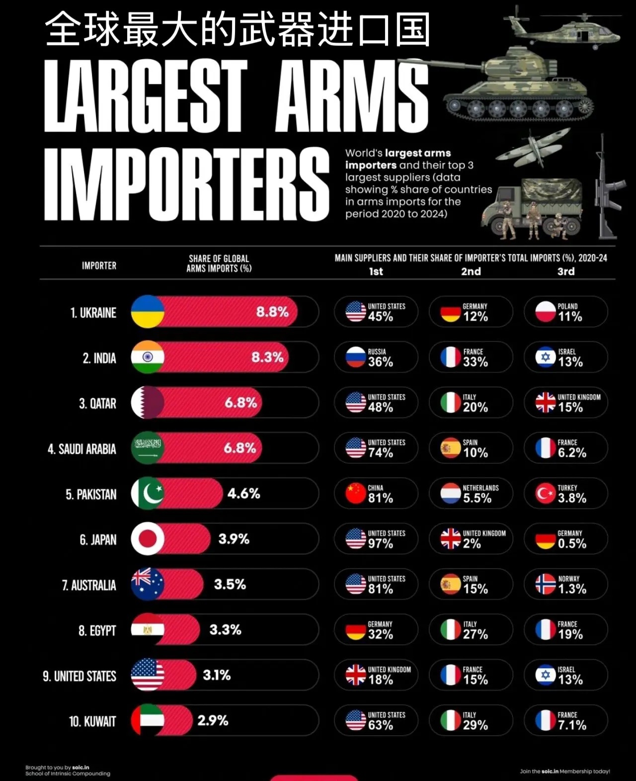 全球軍火出口國家排名及其影響摘要:,,全球軍火出口國家排名反映了各國在軍事技術(shù)和生產(chǎn)能力方面的實力。這些排名及其影響深遠(yuǎn),不僅關(guān)乎國家安全和經(jīng)濟(jì)利益,還涉及地緣政治和全球穩(wěn)定。軍火出口國通過銷售武器和技術(shù),增強(qiáng)了他國的軍事能力,同時也在全球范圍內(nèi)塑造了軍事力量的平衡。過度的軍火競爭和武器擴(kuò)散可能引發(fā)地區(qū)沖突和不穩(wěn)定,對全球安全構(gòu)成威脅。全球軍火出口及其影響應(yīng)引起國際社會的關(guān)注和審慎評估。