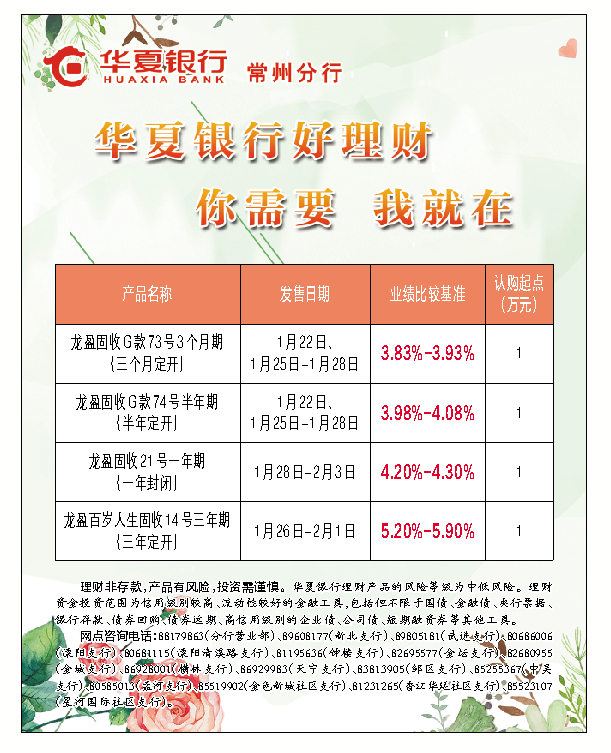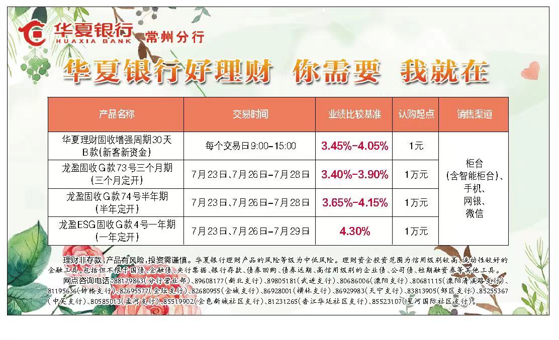 2、豐富的產(chǎn)品線:華夏銀行針對不同客戶群體的需求,推出了不同風(fēng)險等級、不同期限、不同收益類型的理財產(chǎn)品,滿足了投資者的多樣化需求。