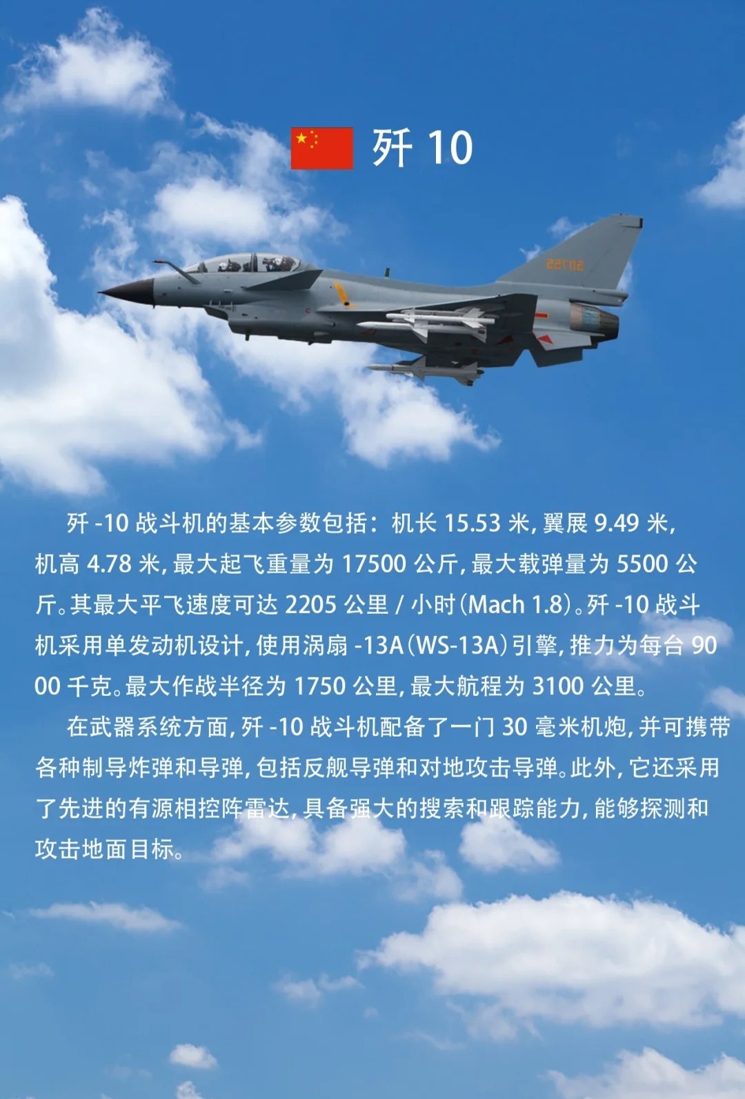 1、多用途作戰(zhàn)能力:殲十戰(zhàn)斗機(jī)具備強(qiáng)大的空中作戰(zhàn)能力,同時(shí)也有很好的對(duì)地攻擊能力,它可以執(zhí)行制空、攔截、支援地面部隊(duì)等多種任務(wù)。